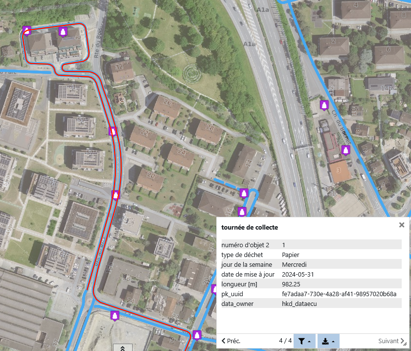 Cartographie des tournées de ramassage des déchets, par type et jour de la semaine. Dans cette exemple, les points de ramassage des ordures ménagères sont identifiés sur la carte.